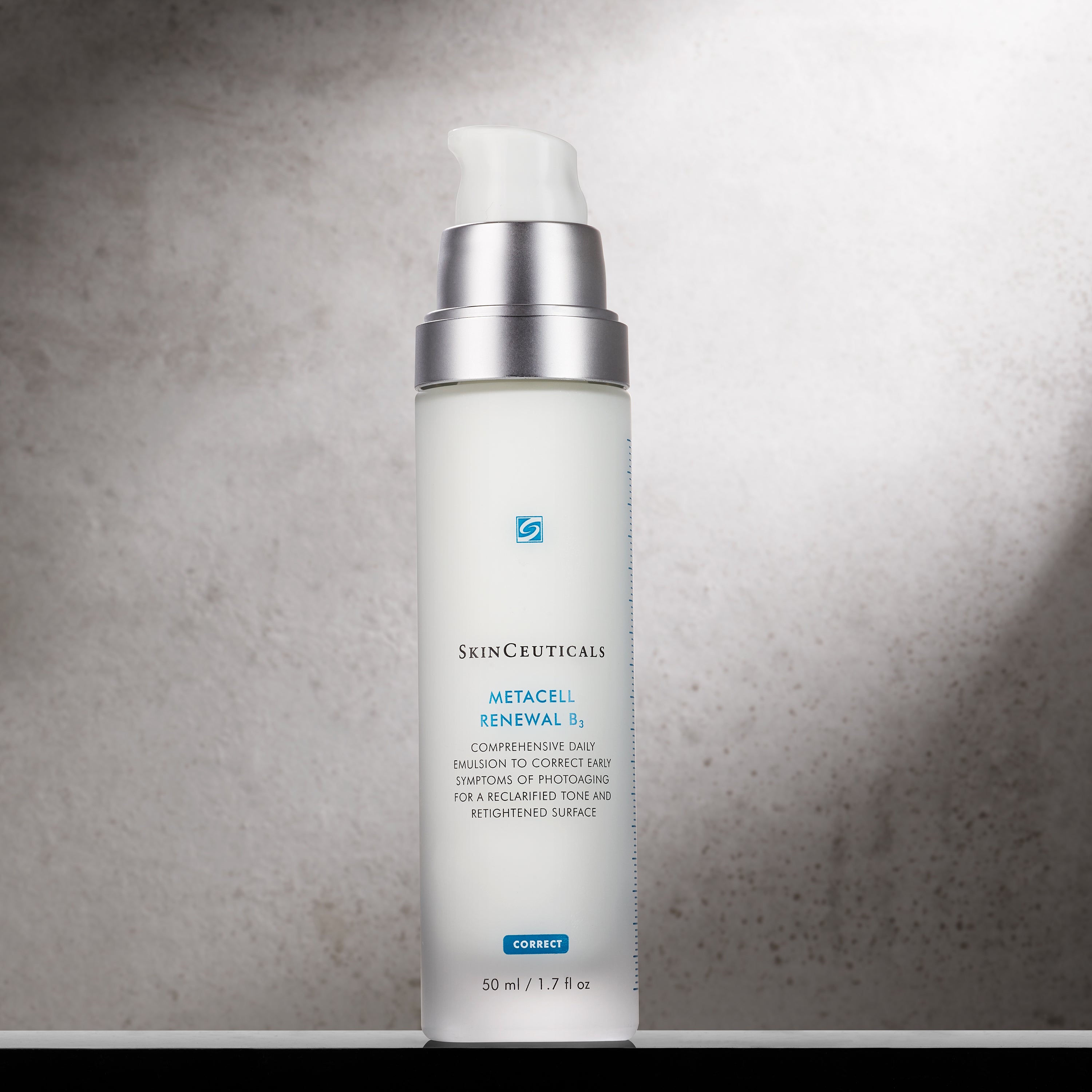 Metacell Renewal B3 utilizes a patent-pending aqueous emulsion to deliver a high concentration of 5% niacinamide (vitamin B3) combined with a firming tripeptide concentrate, and 15% pure glycerin to address early signs of photoaging. While signs of photoaging appear at different intensities according to skin biology, lifestyle, geography, sun protection behavior, and skincare regimen, they have a multiplicative effect, creating a prematurely-aged appearance. This comprehensive daily niacinamide lotion visibly improves these early signs of photoaging by increasing cell turnover to resurface skin, helping reclarify and even skin tone, and improving the appearance of wrinkles and surface elasticity.